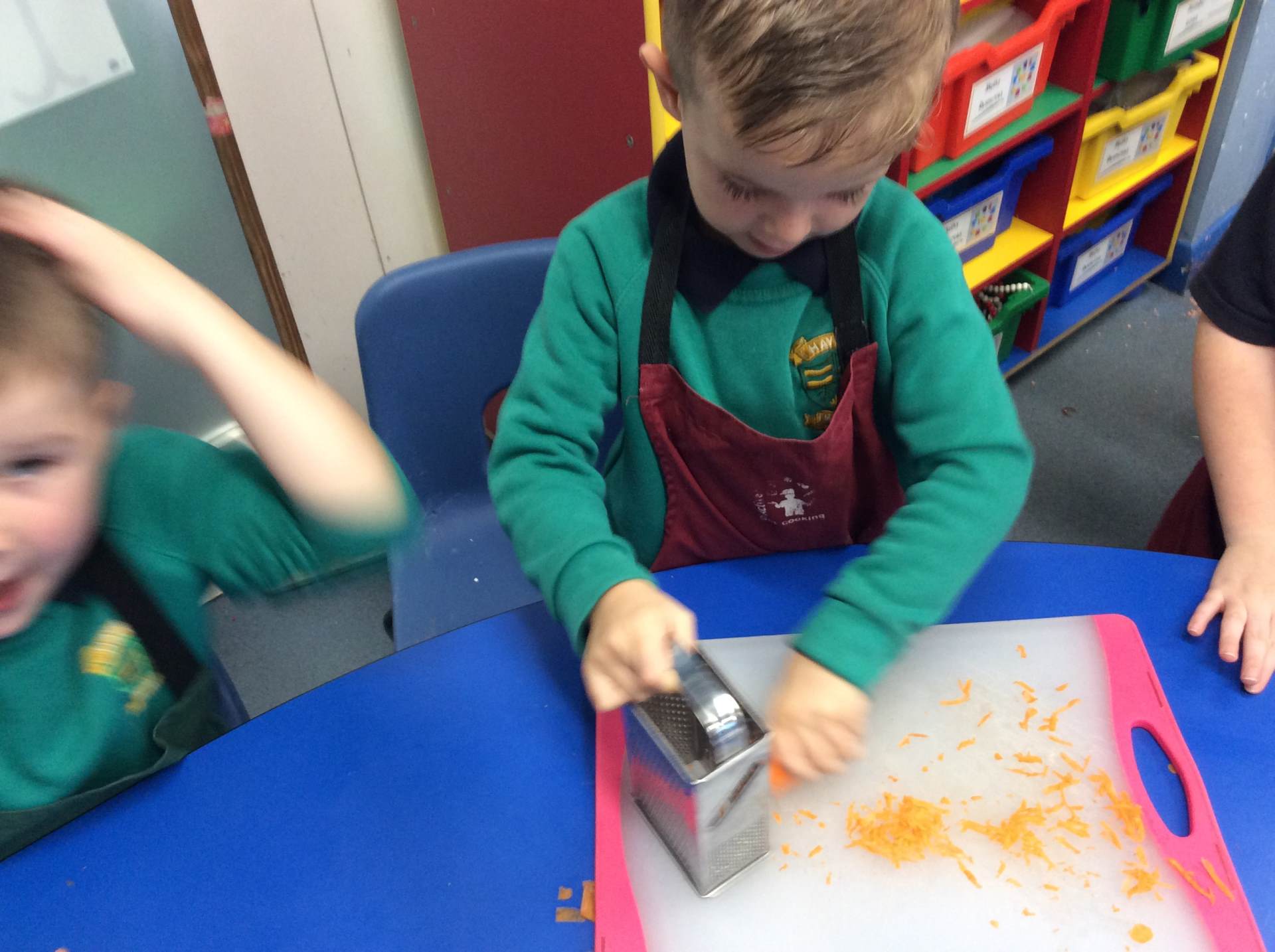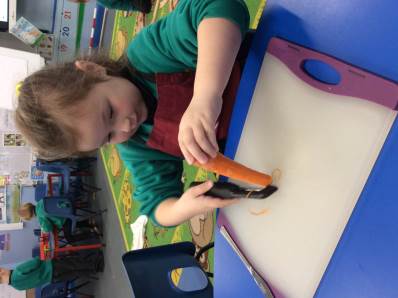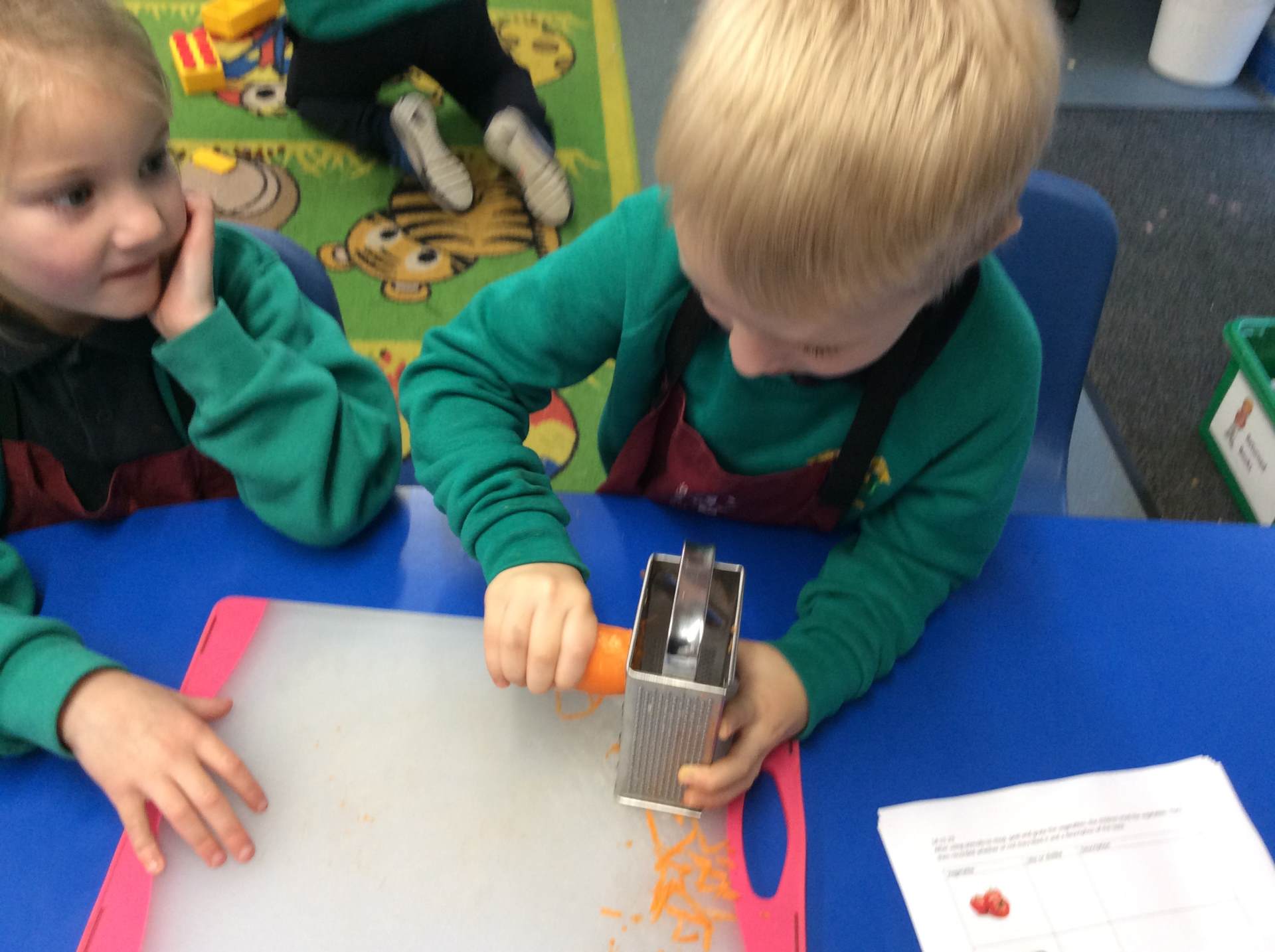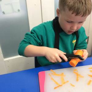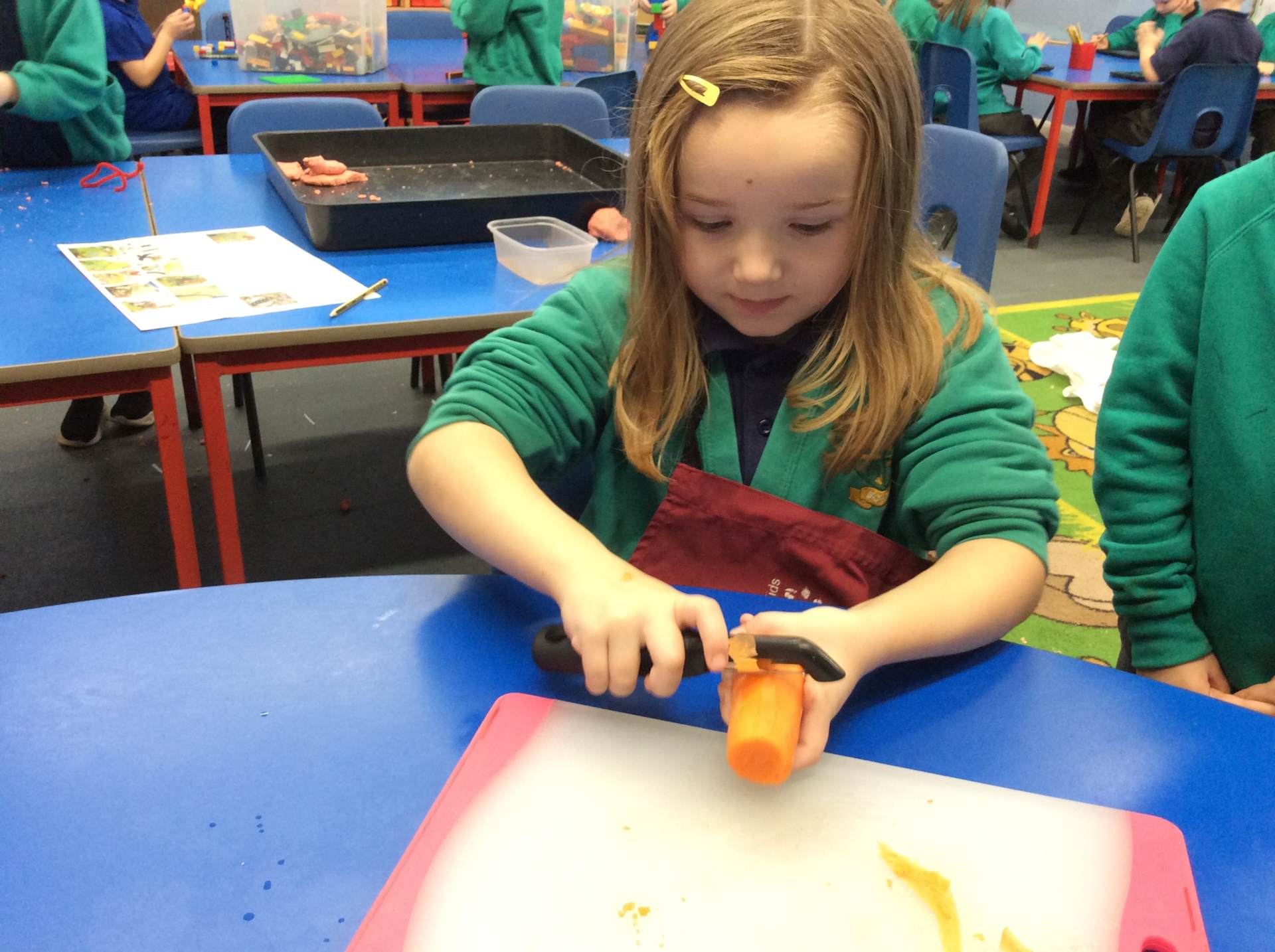 In year 1, the children have learnt about the differences between fruit and vegetables and where they come from. During focused tasks, the children learnt how to chop safely using the claw method and bridge hold as well as how to peel and grate. They also learn the importance of food hygiene.